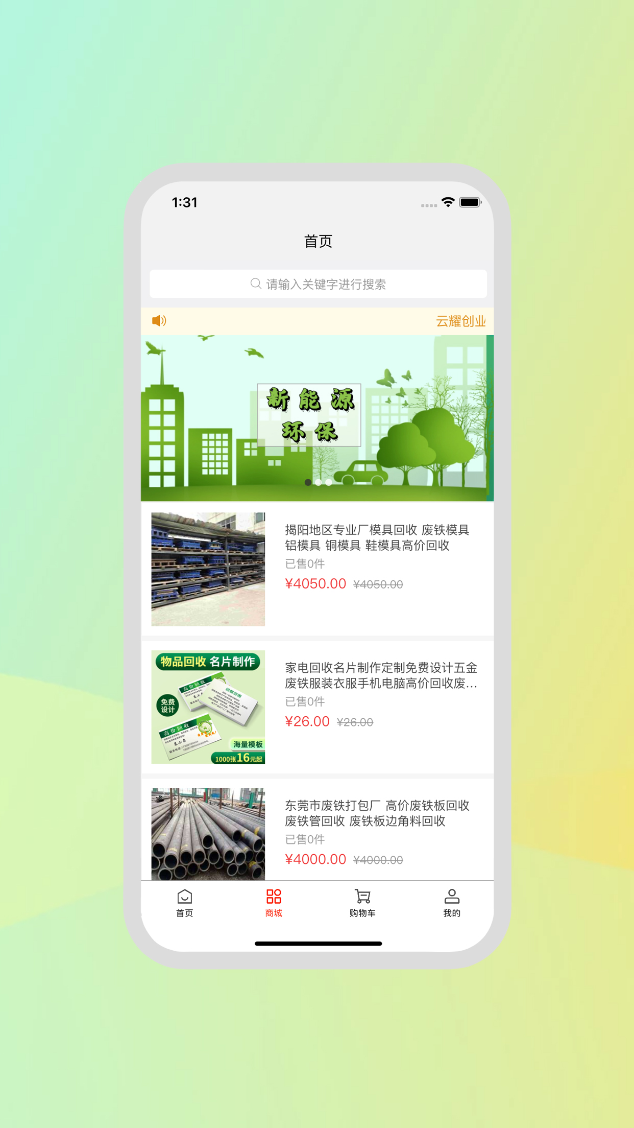云耀创业是一款再生资源回收App,包揽全国各个地区,用户网上下单,上架线下前往回收。